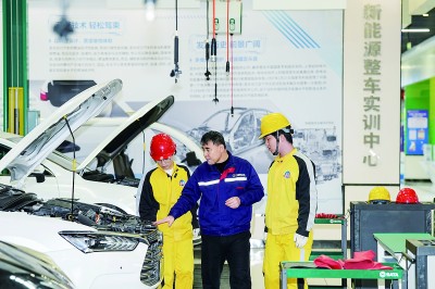 在安徽万通技师学院新能源整车实训中心,老师带领学员熟悉新能源汽车架构。新华社发