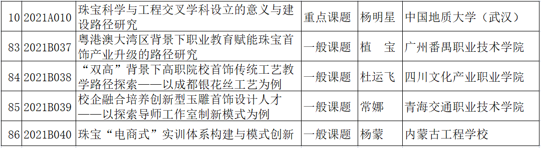 珠宝委为推动珠宝教育职业院校深化教学改革和创新,提高教师的研究能力,2021年6月至12月,珠宝委积极组织会员单位,围绕中国职教学会提出的研究方向,申报了5项研究课题。根据《betway西汉姆联官网关于2021年度立项课题公示的通知》【职教学会〔2021〕45号】,5项课题全部获批立项。
