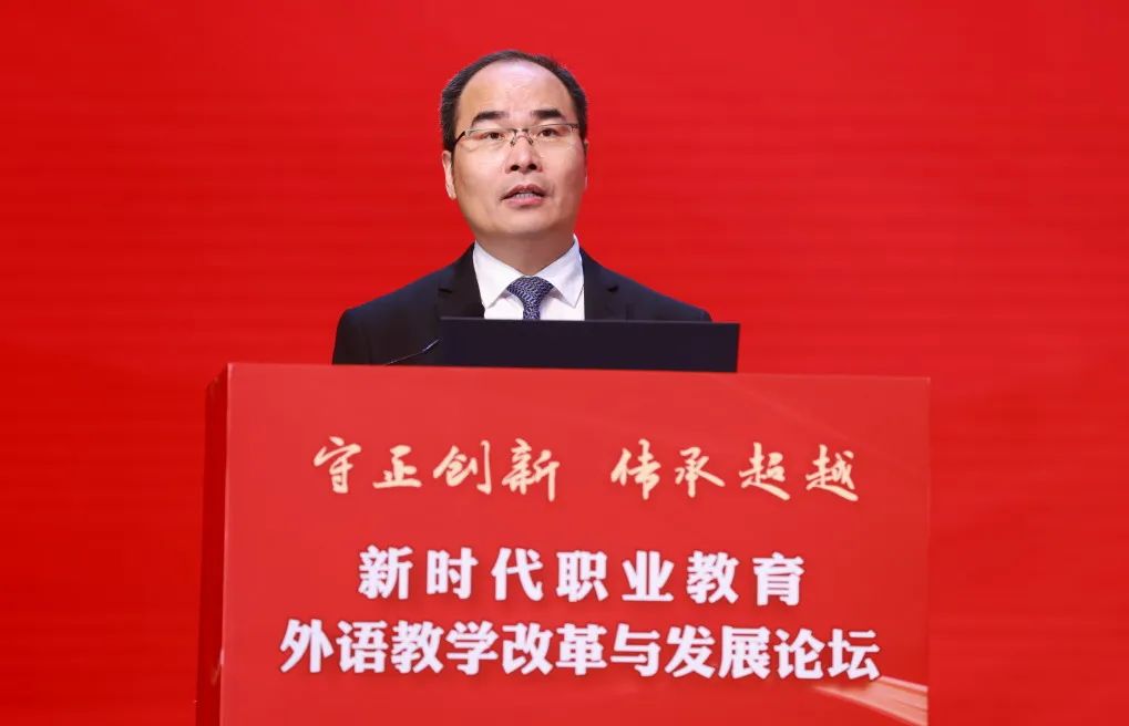 张磊在致辞中表示,在全国职教系统深刻领悟两会精神,认真落实《关于深化现代职业教育体系建设改革的意见》开局起步之际,本次论坛的召开,回应了职业教育的时代使命,展示了外语教学的育人成果,很有意义。围绕新时代职业教育的发展大势与工作部署,张磊提出三点建议:一是深刻把握改革发展新形势。深化外语教学改革创新,助推职业教育“引进来”与“走出去”,助力产教融合、校企合作,促进教育链、人才链与产业链、创新链的深入融合、有机衔接;二是着力加强教学资源建设。充分发挥中国职教学会的智库作用,深入推进外语教学标准修订、课程体系优化、教学模式改革、人才需求调研、课程思政建设等改革探索;三是主动融入数字化建设。立足数字化人才培养,加快职业教育数字化转型,持续开发专业资源库、数字化教材、在线精品课等优质数字化资源,深入探索数字化赋能职业教育外语教学的新模式、新路径。
