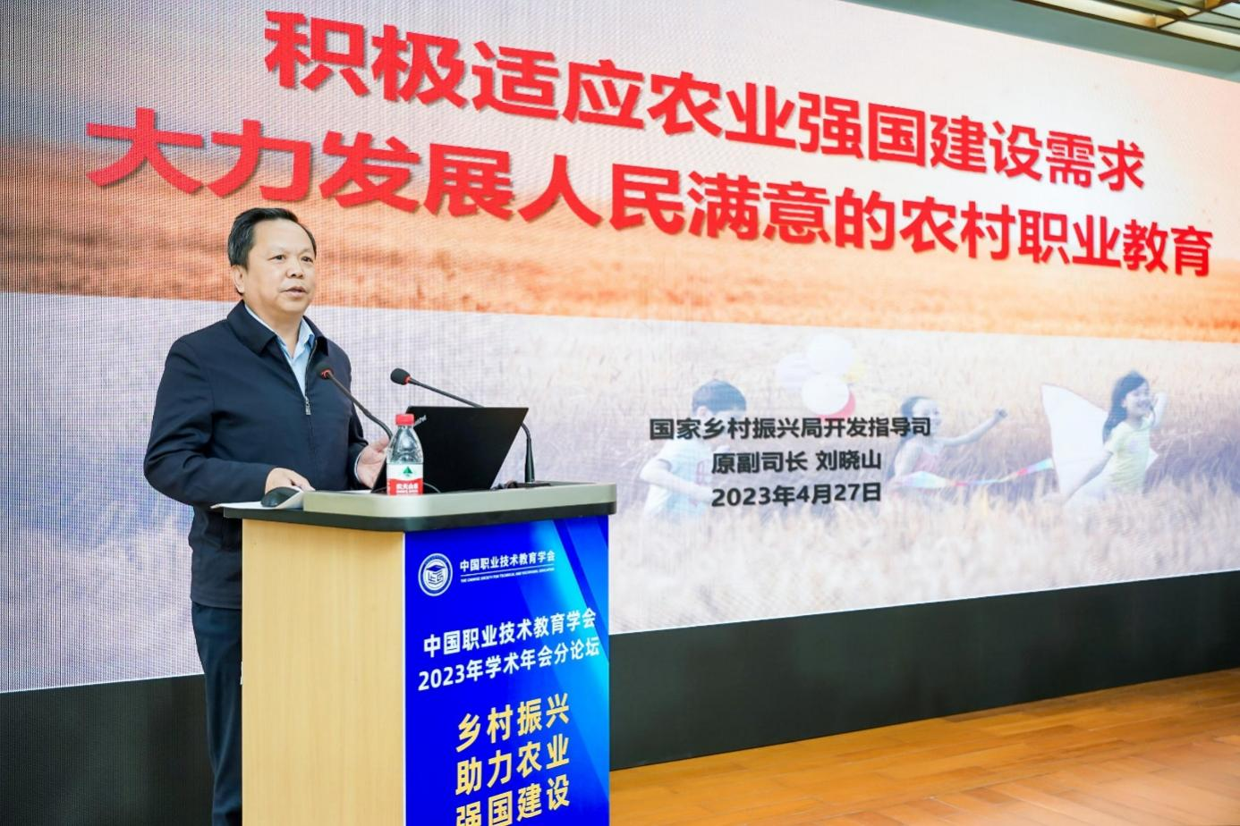 刘晓山作题为《积极适应农业强国建设需求,大力发展人民满意的农村职业教育》的报告。他在报告中指出,要深刻认识加快建设农业强国的重大意义,从国情农情综合考量、五大振兴统筹考虑、软件硬件一体推进、科技改革双轮驱动、巩固成果同乡村振兴有效衔接等方面准确理解建设中国特色农业强国的内涵要义;要适应农业强国建设需求,进一步奠定农村职业教育的发展基础,面向乡村发展需求明确农村职业教育定位,利用数字技术实现农村职业教育跨越发展,发挥职校在农村职业教育中的主体作用,办好人民满意的农村职业教育。