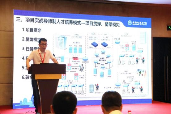长春职业技术学院信息学院副院长、长白山技能名师迟恩宇作“项目实战导师制网络安全人才培养模式研究与实践”主题发言。他认为,建设中国特色高职高水平专业群,核心是培养高素质技术技能人才,关键是打造高水平教学团队、引领“三教”改革。首创了“项目实战导师制”人才培养模式,绘就实施路线图:建立名师工作室组建导师团队,提升团队项目实战指导能力,创设开放式项目实战场景,构建项目化课程体系,开发项目化课程、教材和资源,设置综合项目实践课程、试点项目化小班授课,畅通“岗课赛证融通”育人 途径,实施全程育人和全过程考核评价,培养具备严谨务实精神、铸诚精艺职业素养和可持续发展能力的网络安全领域高素质技术技能人才。