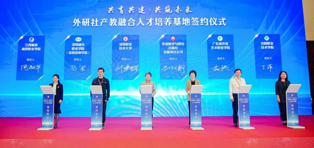 本届论坛还举行了“共育共建·共筑未来”外研社产教融合人才培养基地签约仪式。外语教学与研究出版社和江西旅游商贸职业学院、深圳城市职业学院、深圳职业技术大学、广东省外语艺术职业学院、沈阳职业技术学院现场签约,助建产教融合新生态,共谱校企育人新篇章。