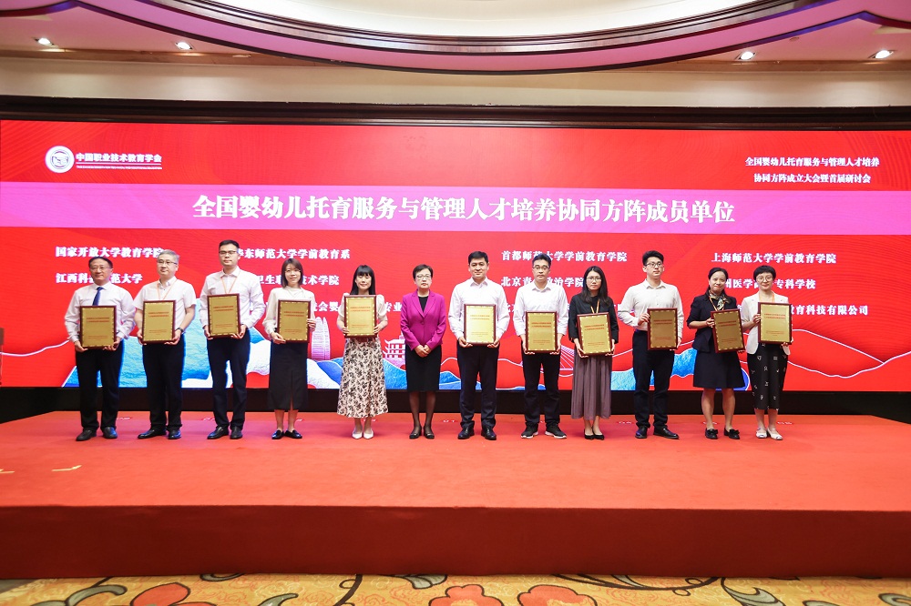 会上,鲁昕、曹彬、谢斌、徐岩等领导共同启动全国婴幼儿托育服务与管理人才培养协同方阵,并为首批29家方阵成员单位授牌。