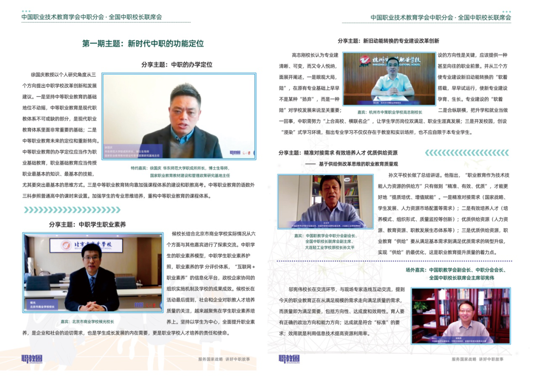 根据疫情防控的整体形势,中职分会积极响应鲁昕会长推动的数字化改造、专业升级的动员令,第一时间将研讨活动转化为“云职播”。邀请行业专家和优秀校长,围绕新时代中职的功能定位、新时代中职的提质培优、化危为机——信息化在疫情教育教学中的应用、数字校园支撑中职更好发展、信息化建设支撑“三教”改革等五个话题组织开展了“云职播”系列活动,累计播放量达到66万次。