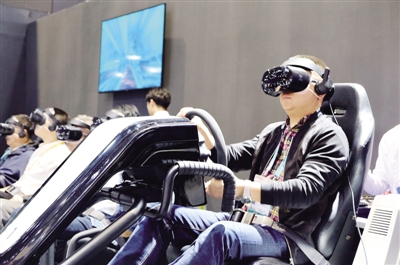 三星展区,观众在体验4D飙车。本报记者 张云摄/光明图片